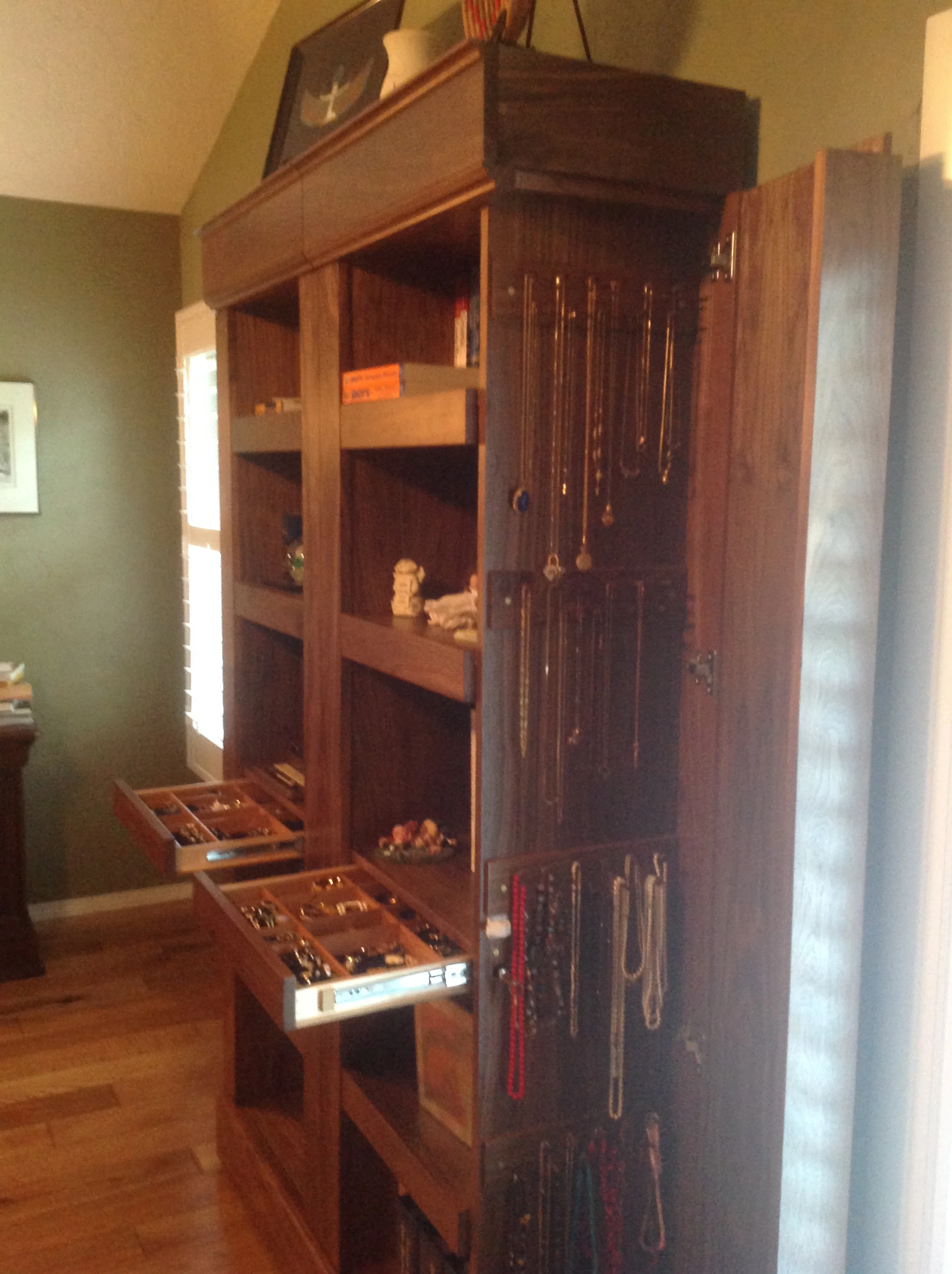 “Our cabinet has worked out very well. The adaption from guns to jewelry is just what we had in mind for security. Since it is located right in our bedroom it is very convenient for my wife to access but secure enough when we are away from home. The concept of hiding it in plane sight is just what we had in mind. Thanks for your design modifications and wonderful workmanship. It is a true craftsman creation.”
